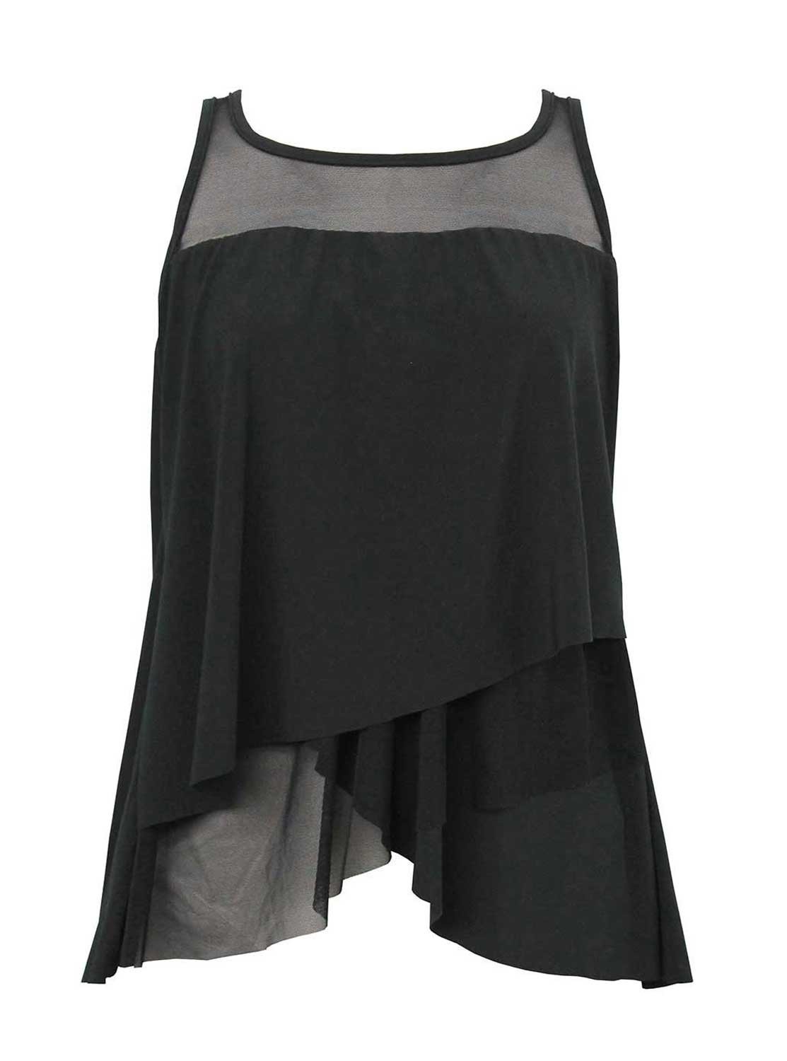 Son décolleté près du cou couvre bien la poitrine et le tissu transparent sur le haut du décolleté vient apporter de la légèreté. Les armatures invisibles assurent un bon maintien de la poitrine et les bretelles réglables permettent un ajustement parfait. Le tankini s’évase sous la poitrine avec un tombé fluide pour une grande liberté de mouvement. Sur l’avant, un jeu de superposition asymétrique de matières donne du caractère à votre tenue et affine visuellement la taille.